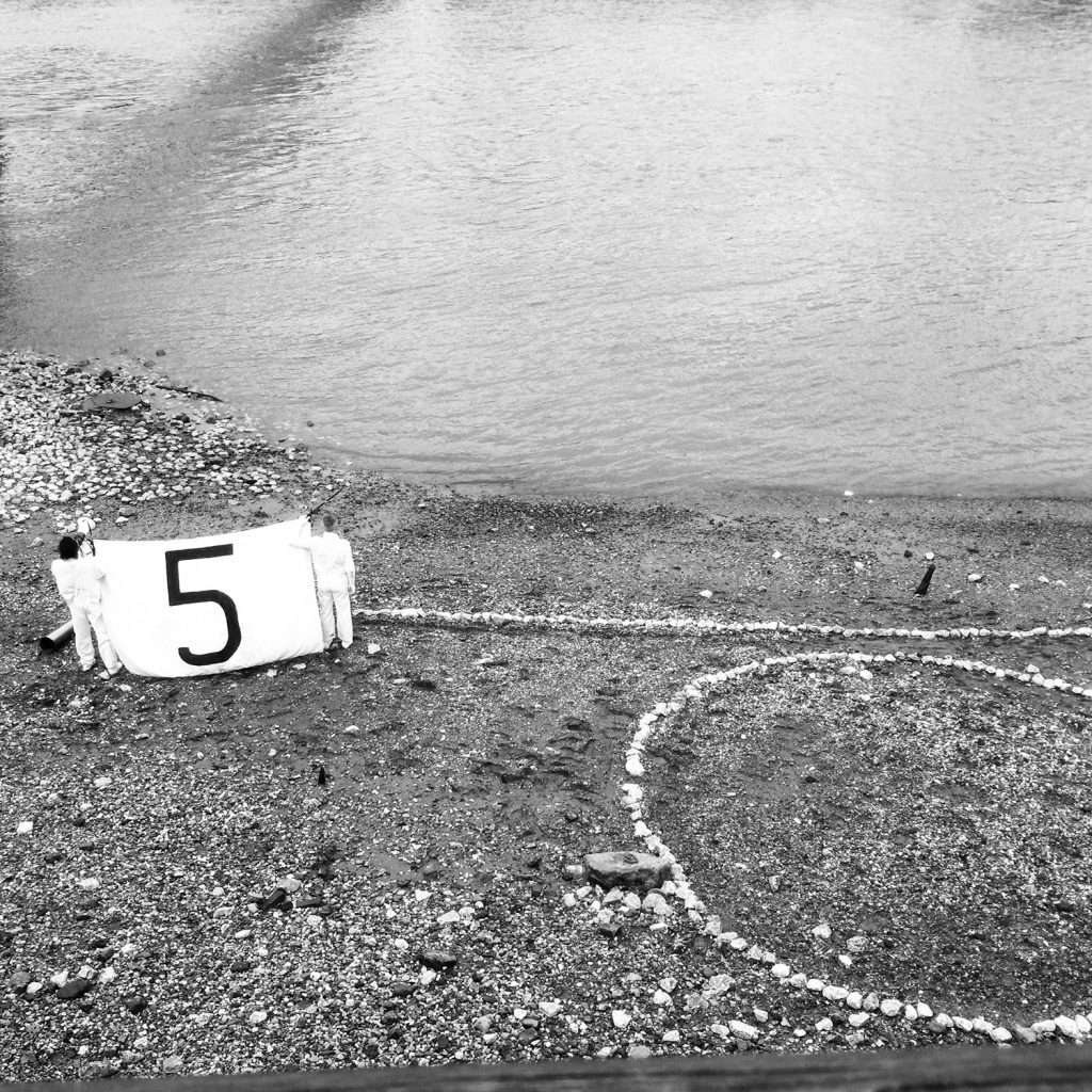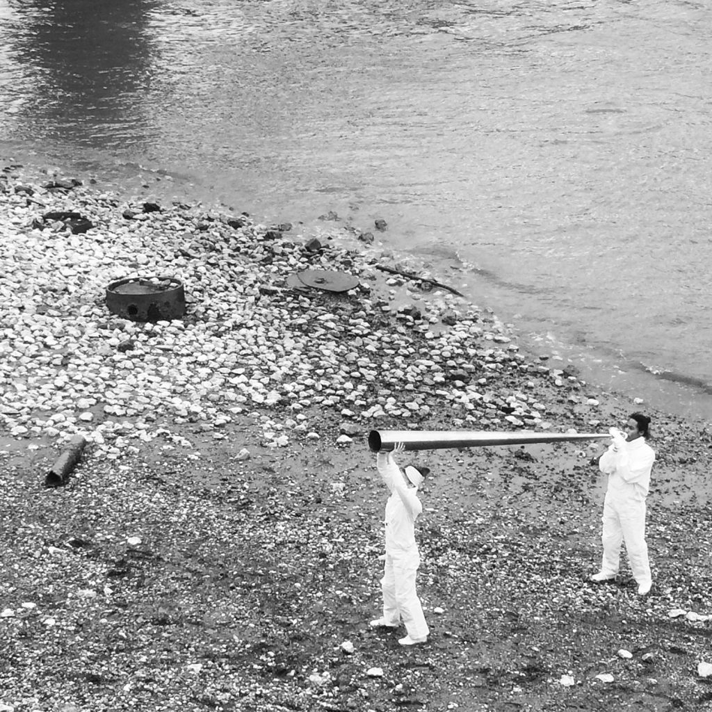 For Delay Delay (London Version) 2018, a group of local dancers and performers enact the basic elements of the earlier works restructured by Jonas to reflect the new site. The spectators stand on the side and watch the action taking place below as the same actions take place across the river on the bank opposite.