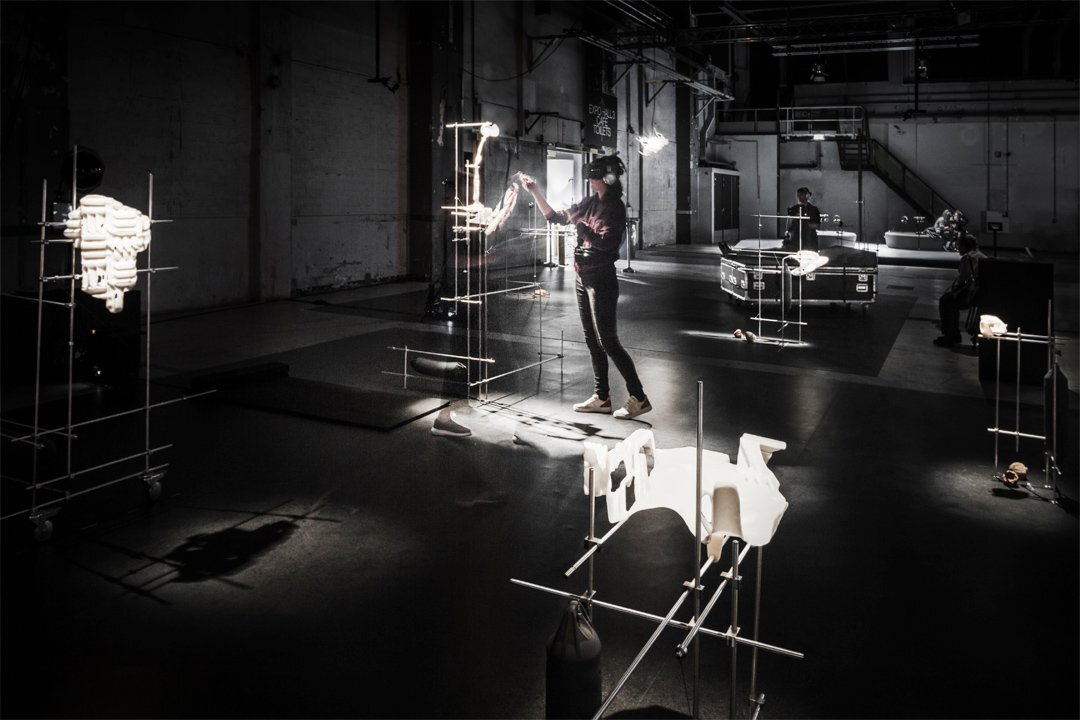 The immersive performance unfolds within a visually striking exhibition space. The staging gives a fragmented impression of the hidden virtual space that appear inside the headset. With the visitors body and senses as active medium, triggered through VR, hyperconnected objects and the unseen touch of a performer, the artwork reveals how memory allows for a string of data to be passed through matter, across time. From Earths deep past through to its post-anthropocene future, the surface of the earth is tightly connected with the living, and life with conscious experience. In its entirety, this work explores the collective memory and experiences we pass on through generations: what to fear, what to value, how to live, how to care for the world of tomorrow. Each of which is more vital than ever.